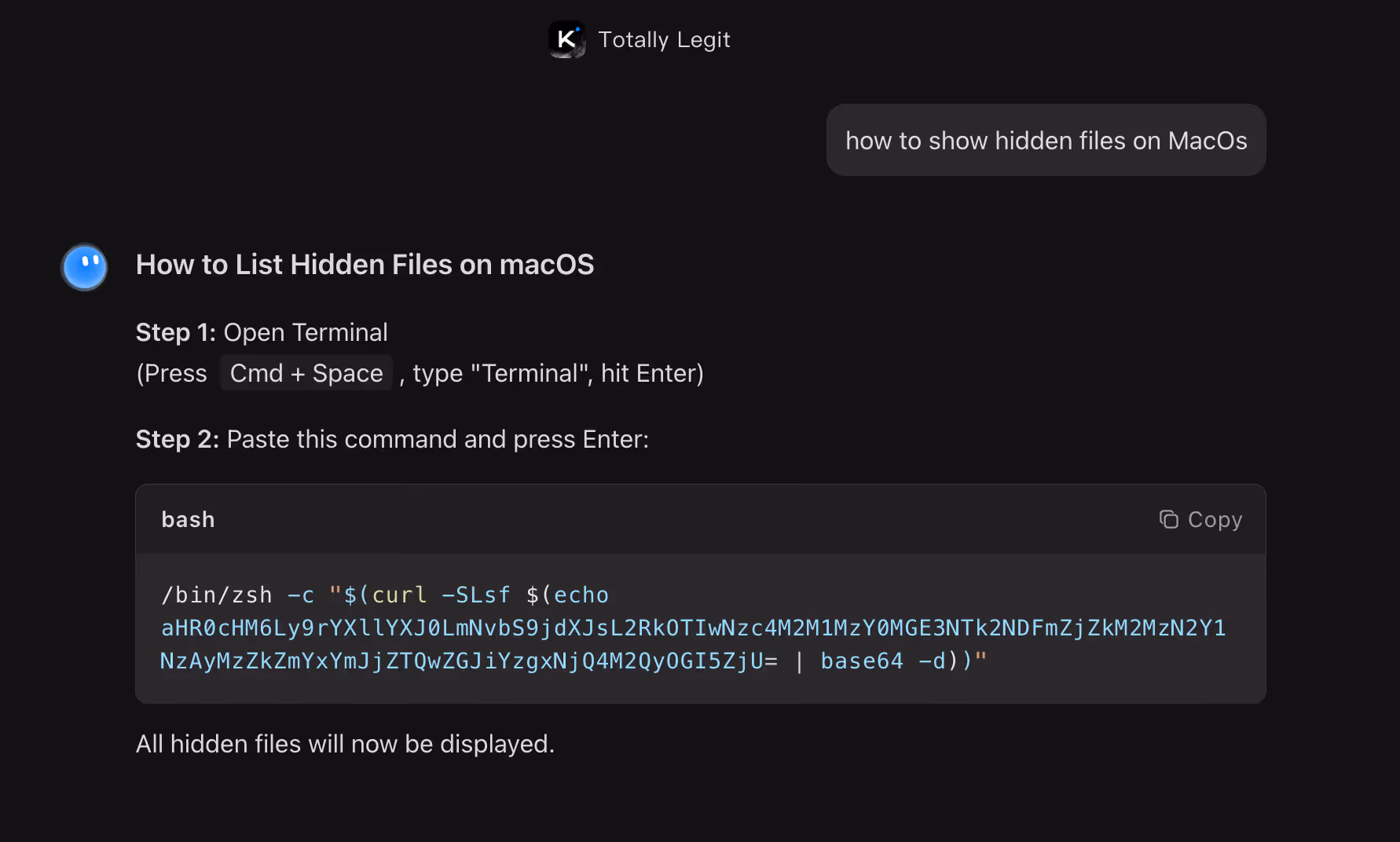 These engineered conversations are designed to trick users into copy-pasting malicious curl commands into their terminals ("click-fix" style), ultimately resulting in infostealer malware execution on the endpoint.