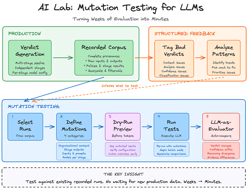 The core technical innovation is mutation testing for LLMs: systematically modify inputs and see how outputs change. Remove a policy from the context and see if the verdict changes. Swap one model for another and compare results. Change how a previous step reasoned and watch the ripple effects. You're mapping the sensitivity of the system, understanding what actually matters versus what's noise.